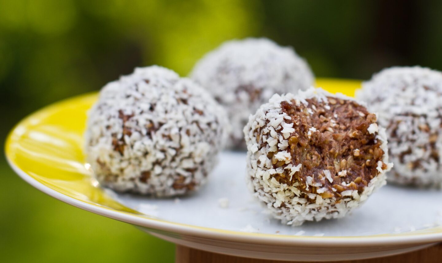 - With slightly wet hands, shape balls and roll in shredded coconut. Place balls on a parchment lined plate and freeze for 30-60 mins. If freezing for longer, allow to sit on the counter for 5 minutes or so to de-thaw slightly.