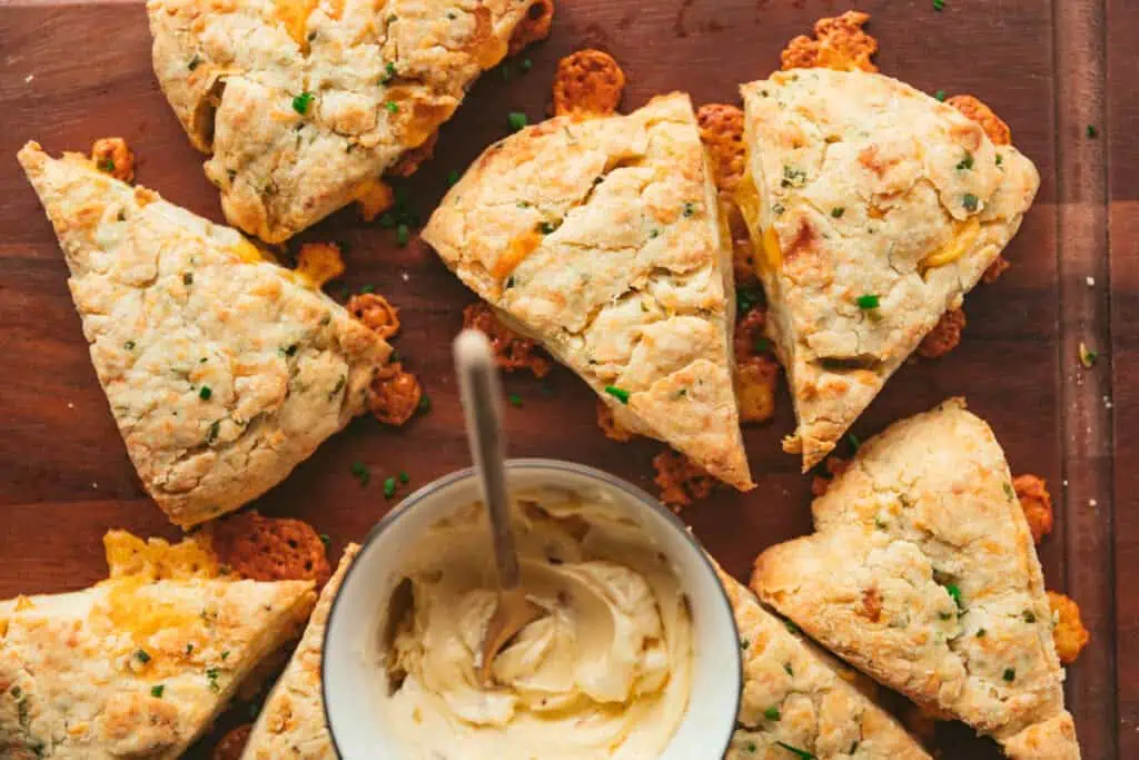These cheddar chive scones are big, flaky, and full of sharp cheddar and fresh chives, finished with whipped hot honey butter for a savory-sweet brunch favorite.