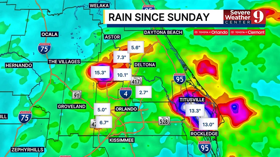 This deluge exceeded the rainfall from recent hurricanes in the Lake County area, leading to widespread flooding. Northern Brevard County also experienced significant flooding, with over a foot of rain since Sunday.