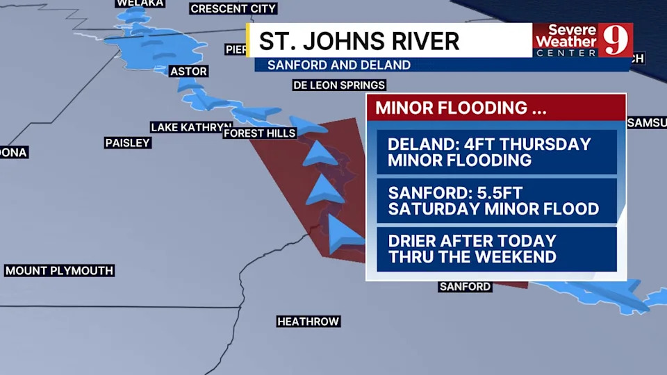 The heavy rainfall has caused the St. Johns River to rise, with minor flooding either occurring now or forecasted to occur later this week.